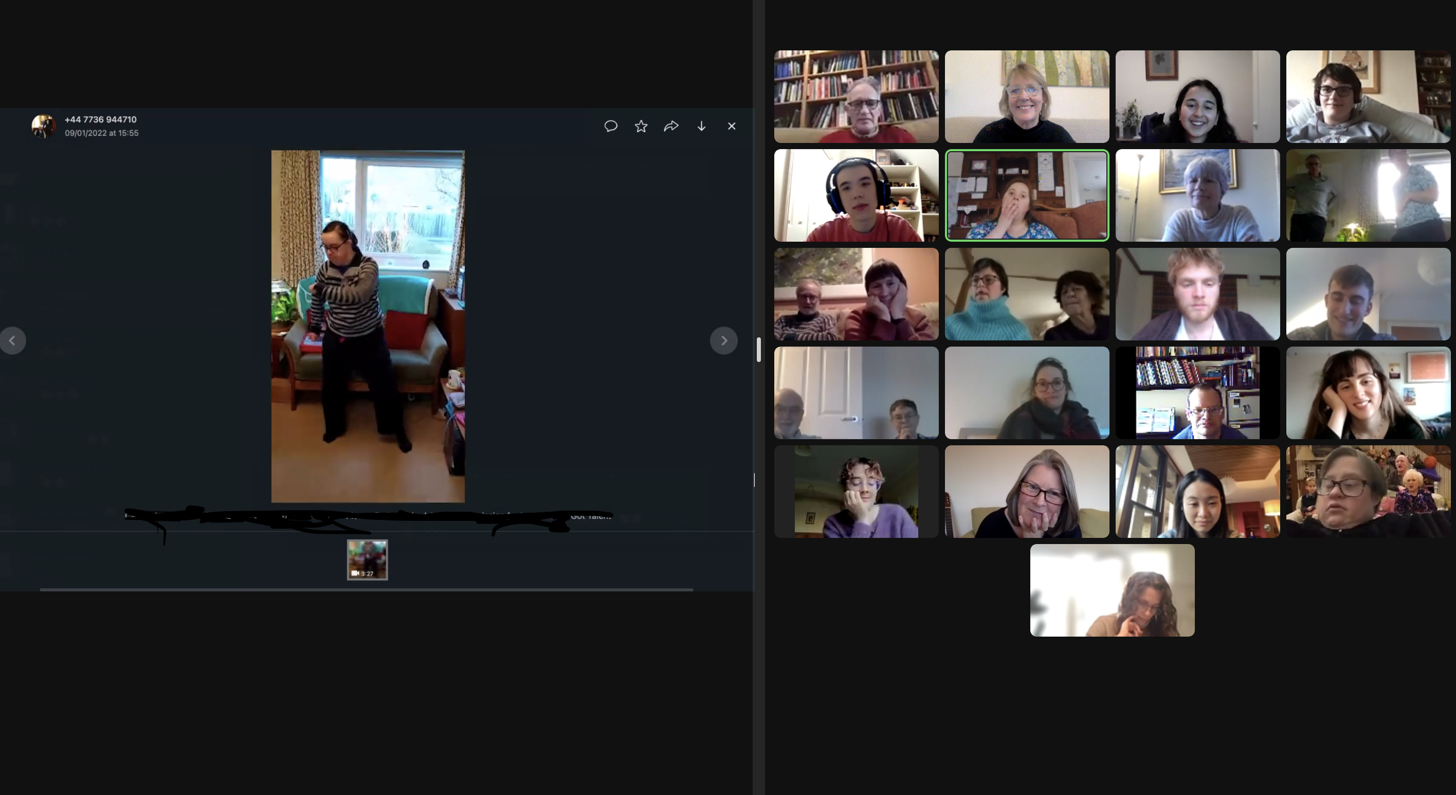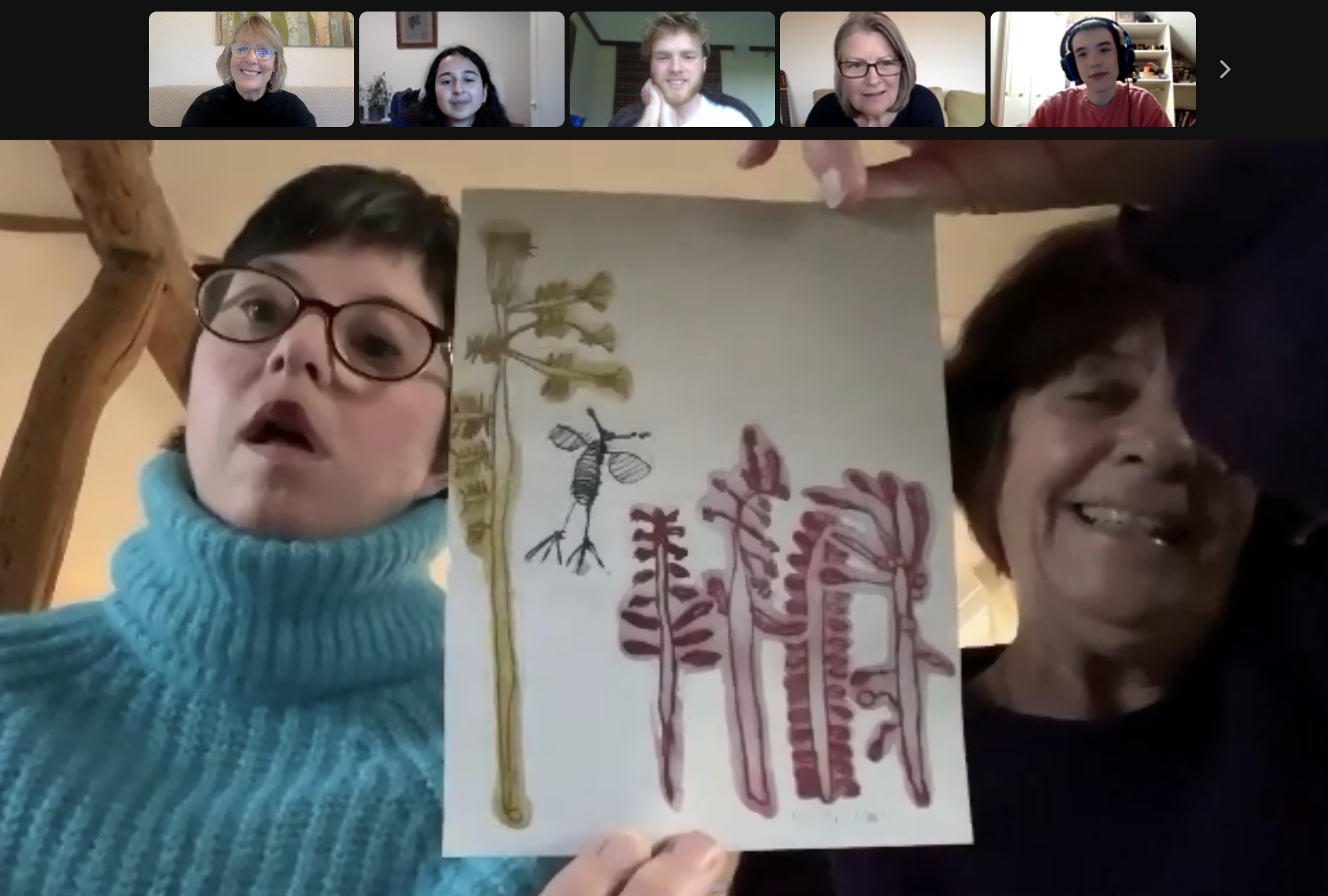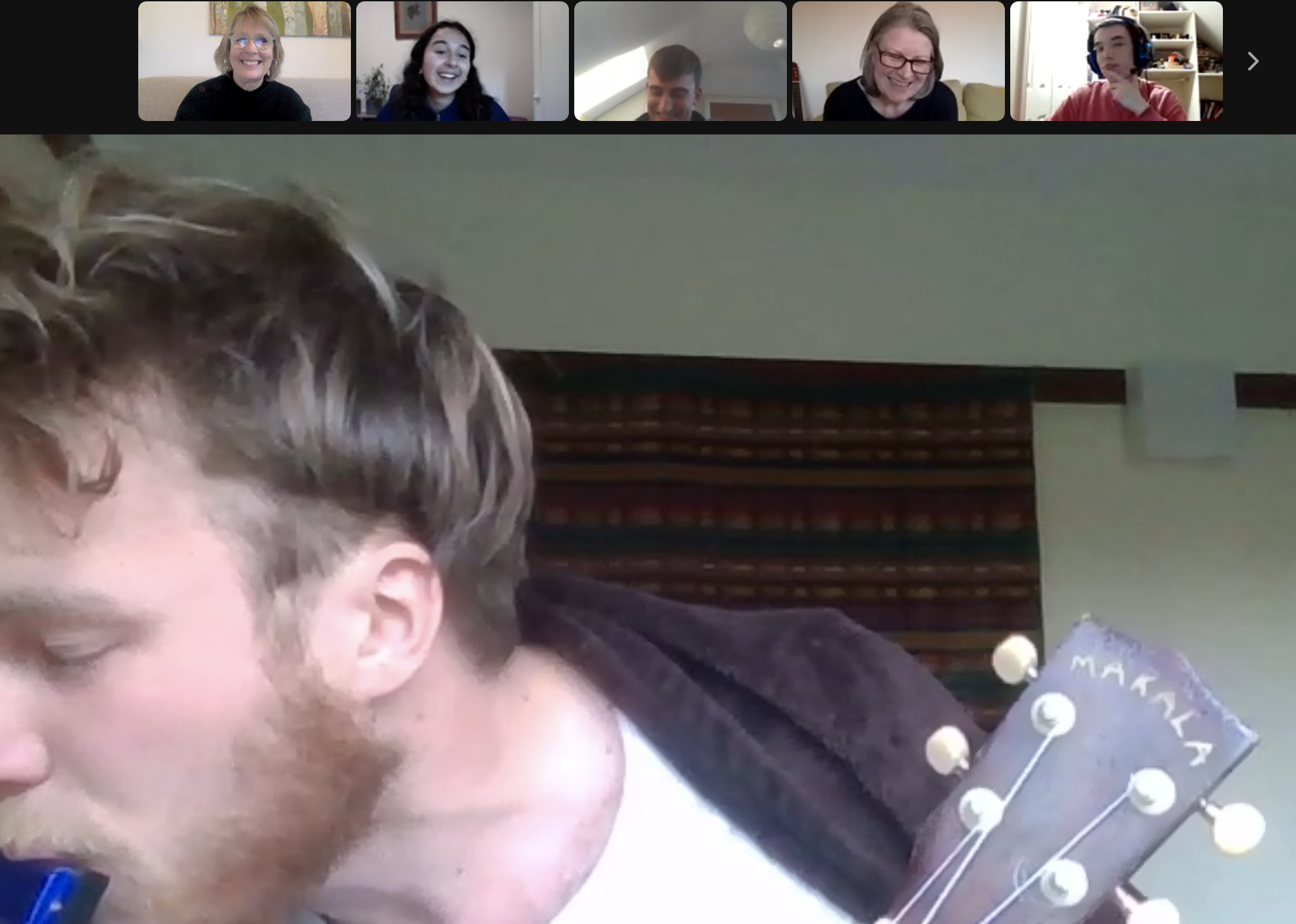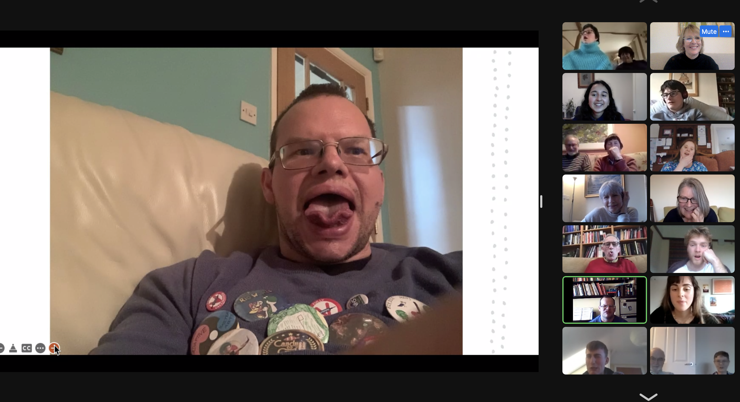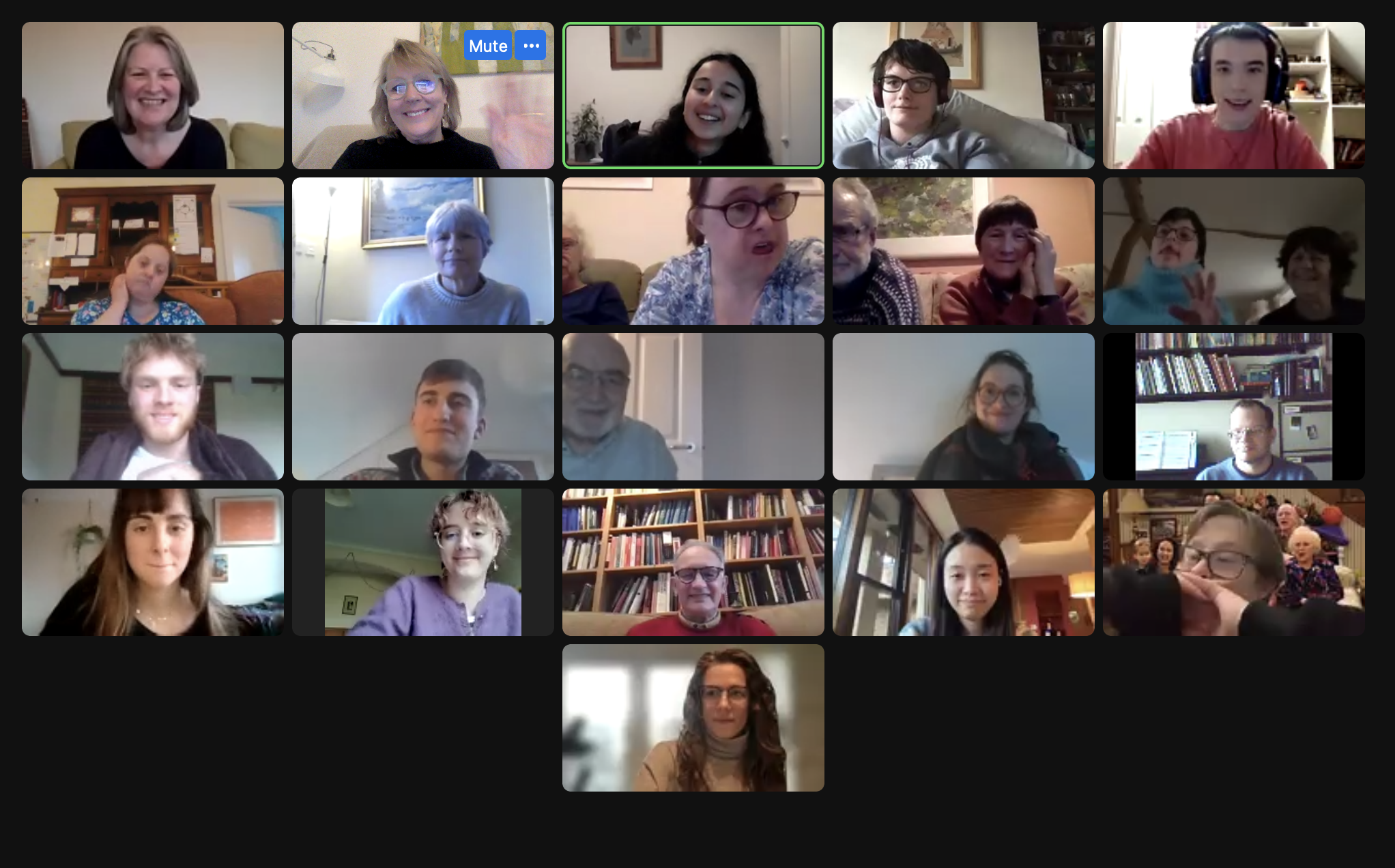 Talents on display in this Zoom gathering included singing, dancing, painting, badge-making, and the rare ability to do a double tongue-roll!