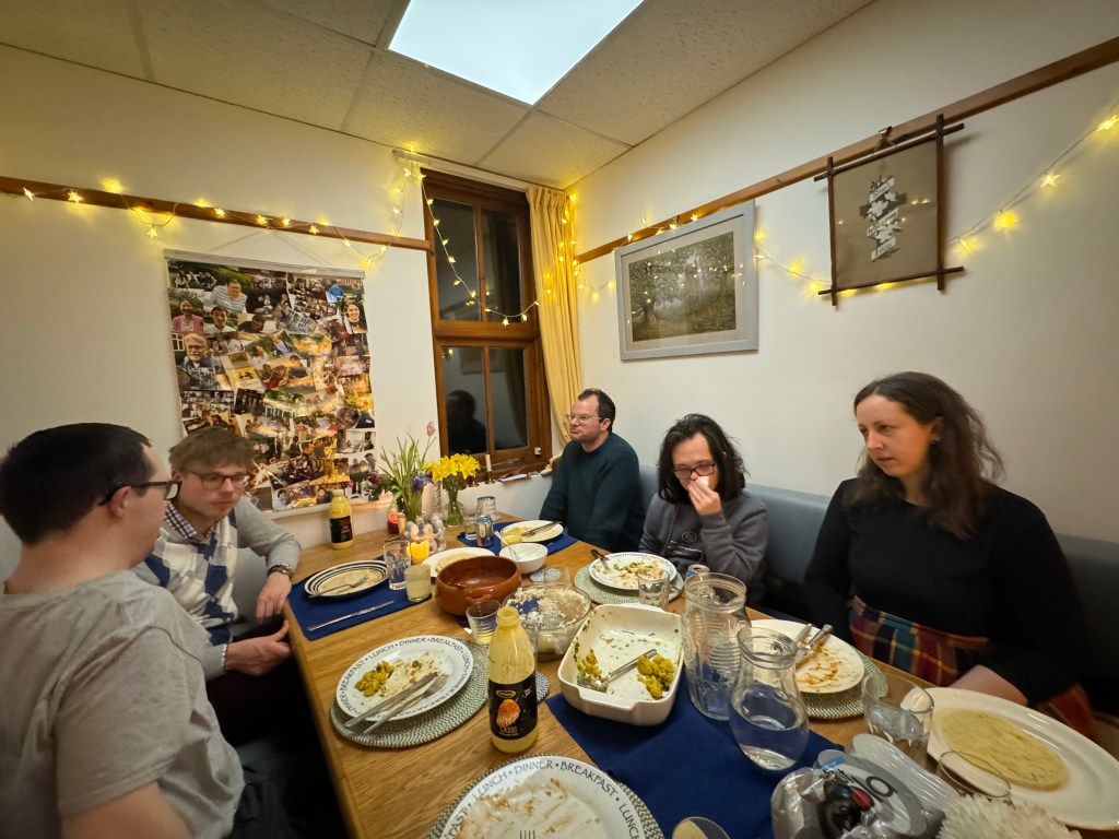 One of our midweek groups had home-made curry together last week. There was butter chicken, aloo gobi, cucumber raita, mango lassi and poppadoms (ok, the lassi and the poppadoms weren’t home-made!)
