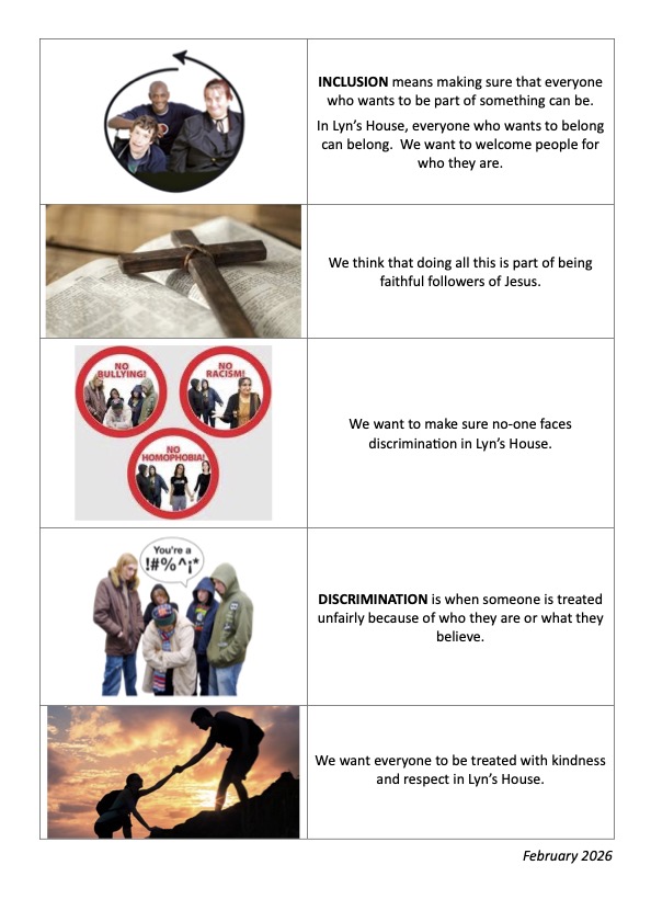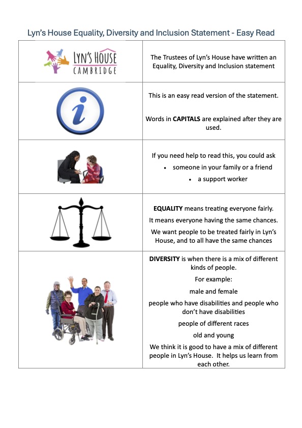 Lyn’s House will not discriminate against anyone regardless of their race, ethnicity, gender, age, disability, pregnancy, maternity, sexual orientation, religion or belief, as defined by the Equality Act 2010. We strive to eliminate discrimination and promote fairness in all our practices and across our entire community. (January 2026).